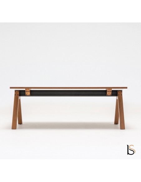 Les piètements en bois sont reliés par une poutre structurelle en aluminium coloris noir.
