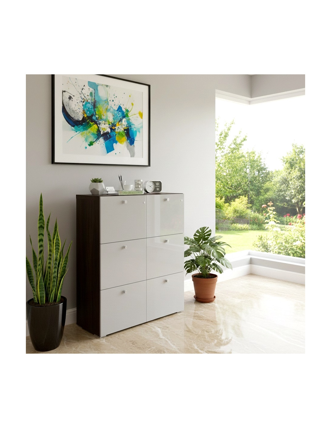 Les tiroirs quant à eux sont disponibles en stratifié brillant noir ou blanc et disposent d’un système de fermeture par serrure.