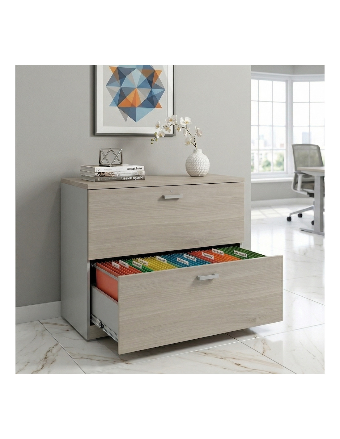 Modèle 2 Tiroirs (présenté ici) : Un format "hauteur bureau" idéal pour garder vos dossiers à portée de main tout en conservant une surface de pose utile.