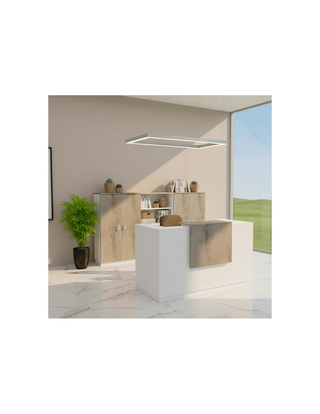 A noter également que cette banque d'accueil dispose de tout un programme de rangement tels que les caissons, les armoires de bureau.