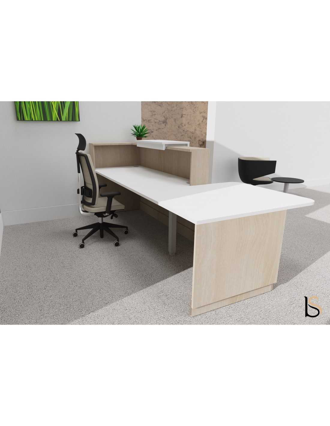 La banque d'accueil Delta avec PMR et réhausse de Mobel Linea est également un élément de décoration à part entière. Avec un choix parmi 12 teintes différentes, vous pouvez personnaliser ce meuble pour qu'il s'intègre parfaitement à l'ambiance de votre espace d'accueil. Que vous visiez une atmosphère apaisante avec des tons neutres ou que vous souhaitiez insuffler une touche de chaleur avec des finitions boisées, cette banque d'accueil s'adapte à vos préférences. La réhausse blanche avec la possibilité de l'équiper d'un kit lumineux par LED ajoute une touche moderne et dynamique, tout en soulignant discrètement votre logo ou les informations de votre entreprise, si vous choisissez de l'utiliser.