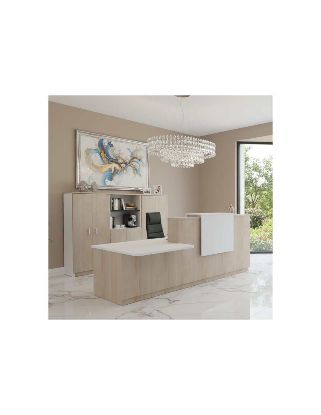 A noter également que cette banque d'accueil dispose de tout un programme de rangement tels que les caissons, les armoires de bureau.