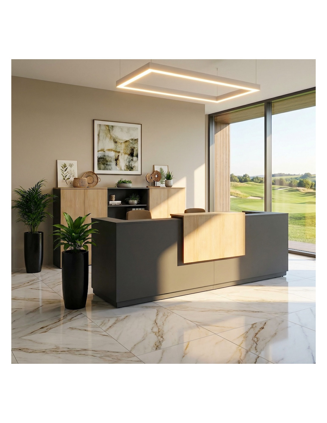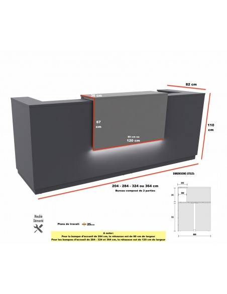 En complément de son design attrayant, le bureau d'accueil Delta 2 personnes anthracite de Mobel Linea est conçu pour répondre aux exigences pratiques des espaces de réception à fort trafic. La gamme propose des solutions de rangement assortis, comme des caissons, des armoires et des étagères, qui s'adaptent parfaitement au bureau et contribuent à un environnement de travail ordonné et fonctionnel. La solidité de sa structure en bois mélaminé et son usage intensif sont garantis pendant trois ans, avec une garantie d'un an pour l'éclairage LED, si vous ajoutez l'option lors de la configuration de votre bureau. La hauteur de 110 cm et la profondeur de 82 cm offrent un espace de travail confortable pour le personnel, tout en maintenant une interaction aisée avec les clients.