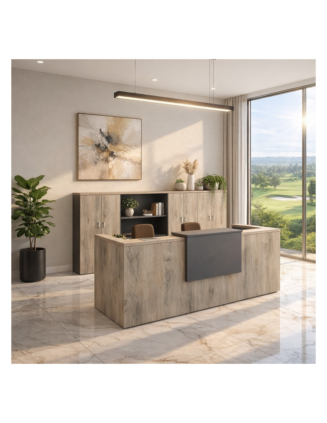 A noter également que cette banque d'accueil dispose de tout un programme de rangement tels que les caissons, les armoires de bureau.