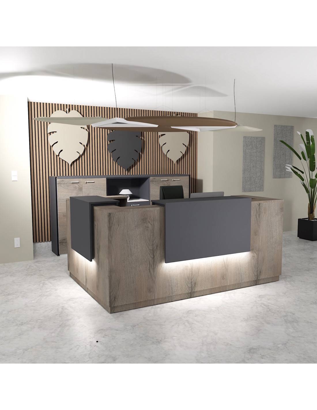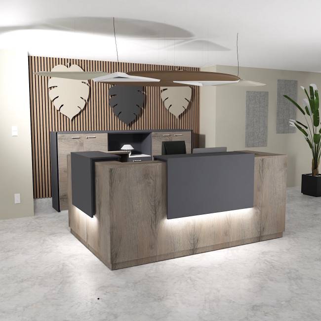 Le Delta offre de nombreuses options de personnalisation pour s'adapter à votre style et à vos besoins. Les réhausses peuvent être personnalisées avec différentes finitions et couleurs, tandis que l'éclairage LED permet de créer une ambiance unique et haut de gamme. Ce comptoir d'accueil modulable s'intègre parfaitement à tout type d'environnement professionnel.