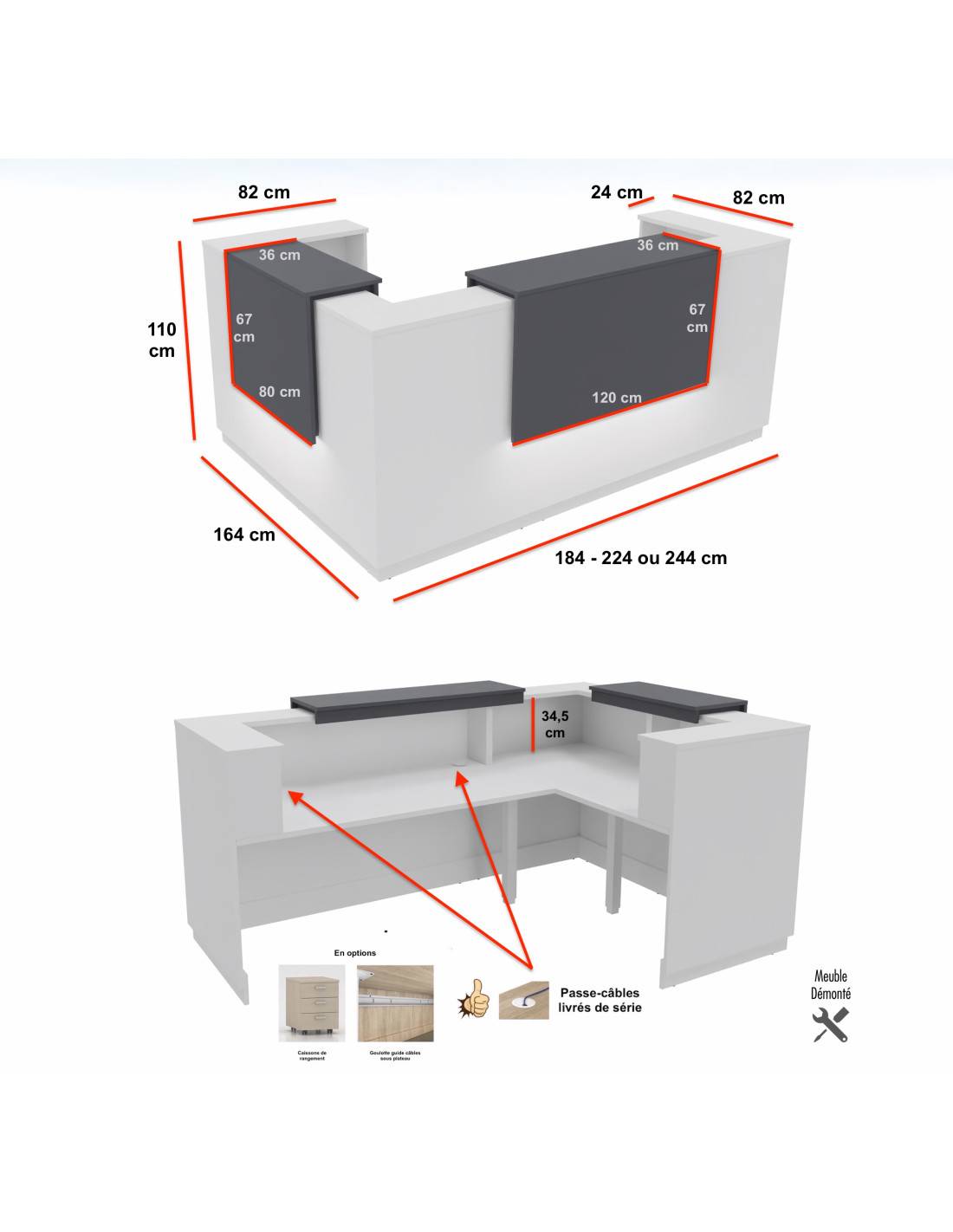 Disponible en trois largeurs (184 cm, 224 cm et 244 cm), le comptoir Delta s'adapte à tous les espaces, des plus restreints aux plus vastes. Sa hauteur de 110 cm et sa profondeur de 164 cm offrent un espace de travail confortable et ergonomique pour votre personnel d'accueil. Les deux réhausses, de 120 cm et 80 cm, peuvent être rétro-éclairées en option, ajoutant une touche d'élégance et de visibilité. Cette modularité vous permet de configurer votre comptoir d'accueil selon vos besoins spécifiques.
