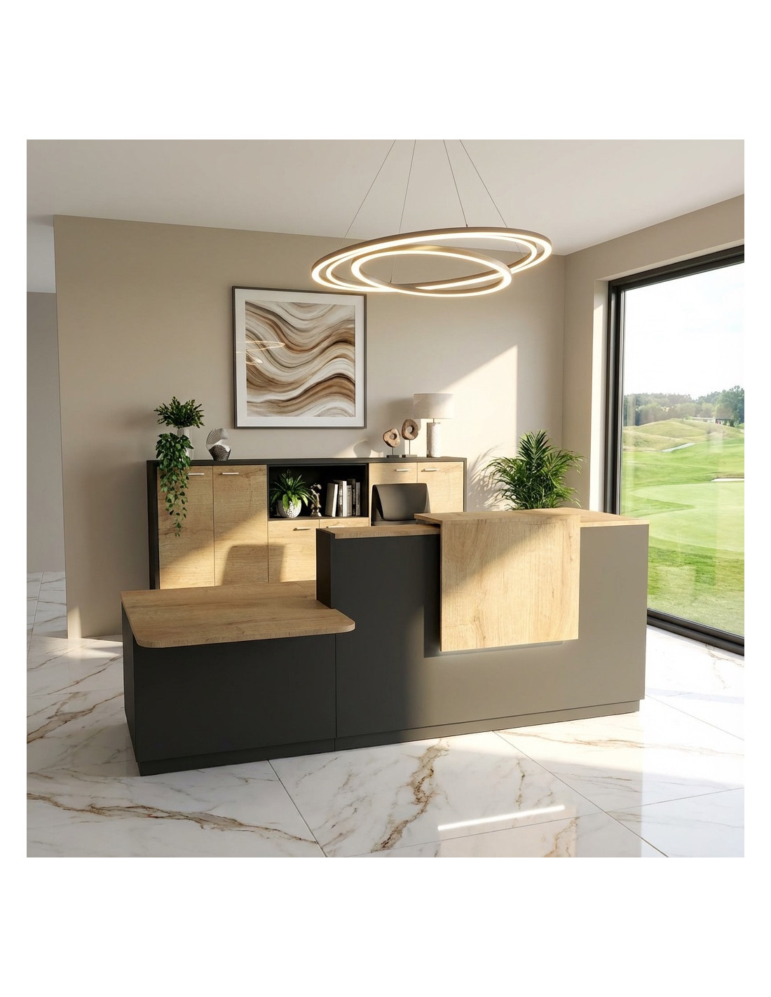 Le comptoir de réception client Delta est disponible dans de nombreuses configurations, nous vous proposons ici une version coloris noir, blanc ou anthracite avec la réhausse et les plans de travail assortis dans des tons bois tendances apportant ainsi un accueil chaleureux.