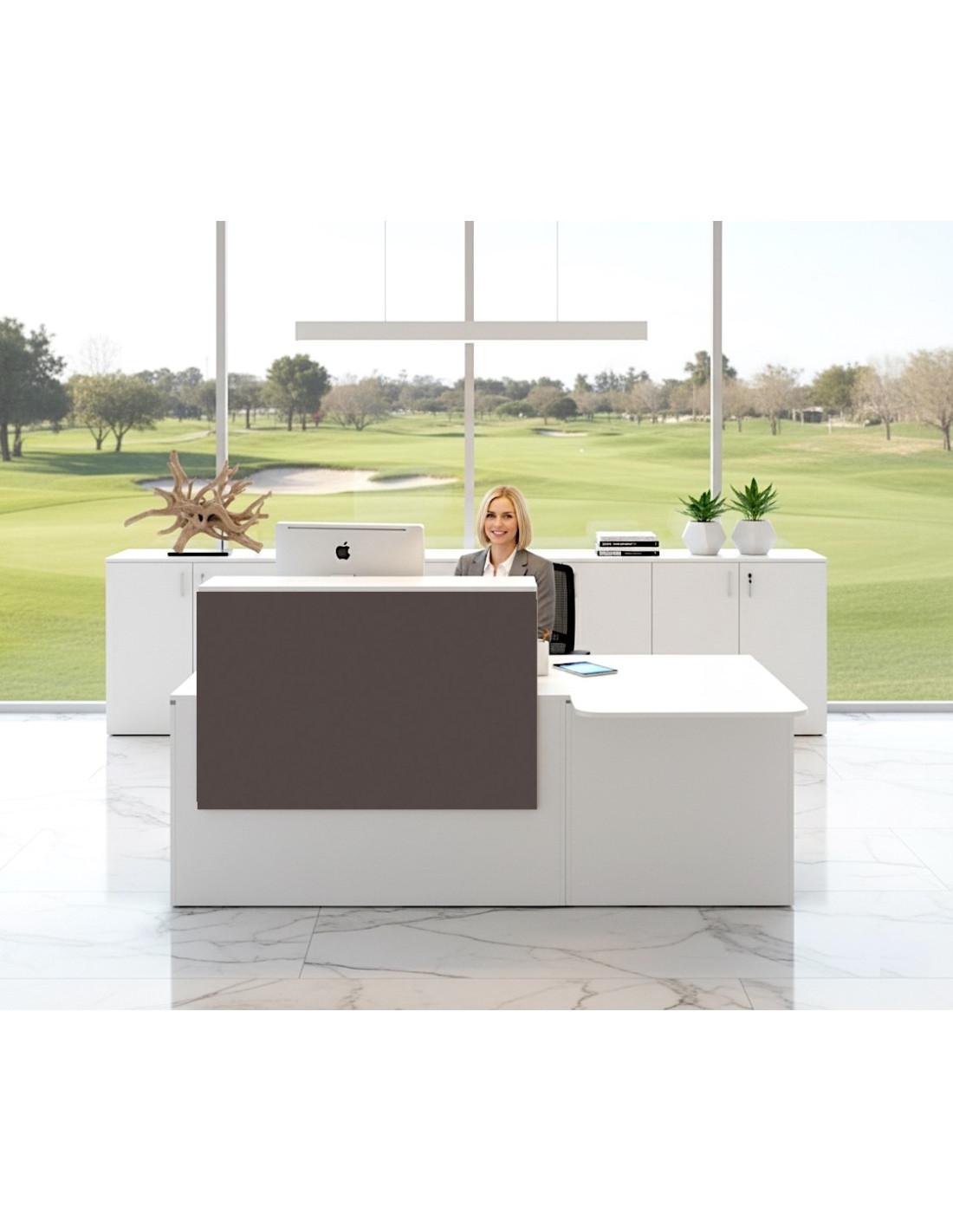 Design et Fonctionnalité : Dotée d'un design épuré et contemporain, la banque d'accueil Pano combine esthétique et fonctionnalité. Le plan de travail ergonomique offre un confort optimal pour le personnel, tandis que la façade personnalisable ajoute une touche distinctive à votre espace. Les caissons assortis (hauts ou bas) peuvent compléter l'ensemble pour un rangement discret et efficace.