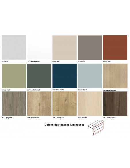 - Coloris disponibles pour la façade: chêne Canadien, wengé, blanc brillant, orange brillant,vert brillant, bordeaux brillant, jaune brillant, rose brillant ou gris brillant.