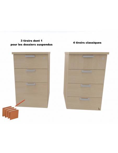Le grand caisson, positionnable à droite ou à gauche à sélectionner via le configurateur, offre un espace de rangement considérable avec la possibilité de choisir entre quatre tiroirs simples ou trois tiroirs, dont un adapté aux dossiers suspendus.