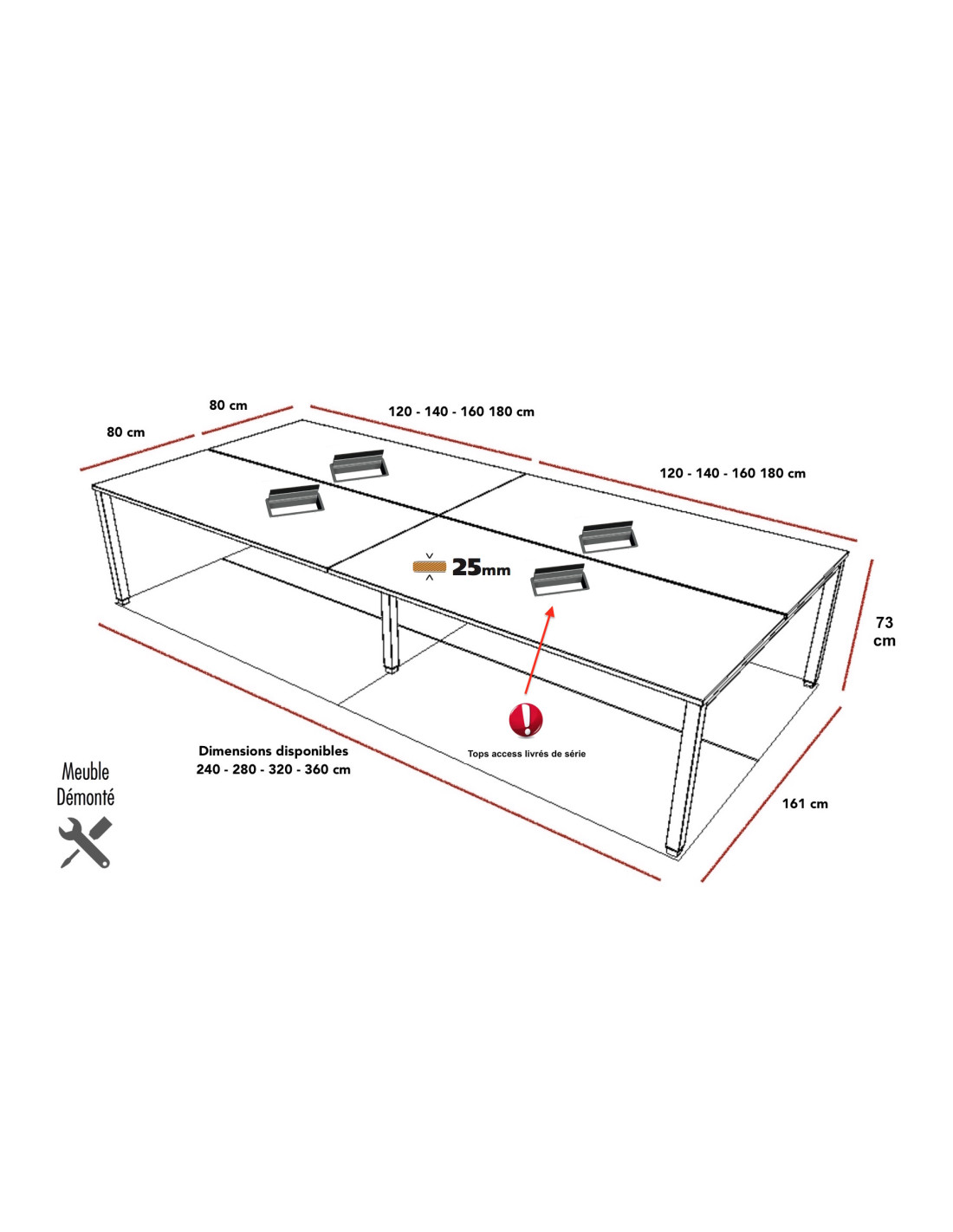 Optimisez l'agencement de vos espaces de travail collaboratifs avec le bureau bench Tempo 4 personnes de Mobel Linea. Conçu pour s'adapter aux besoins évolutifs de votre entreprise, ce bureau professionnel combine modularité, ergonomie et design moderne.
