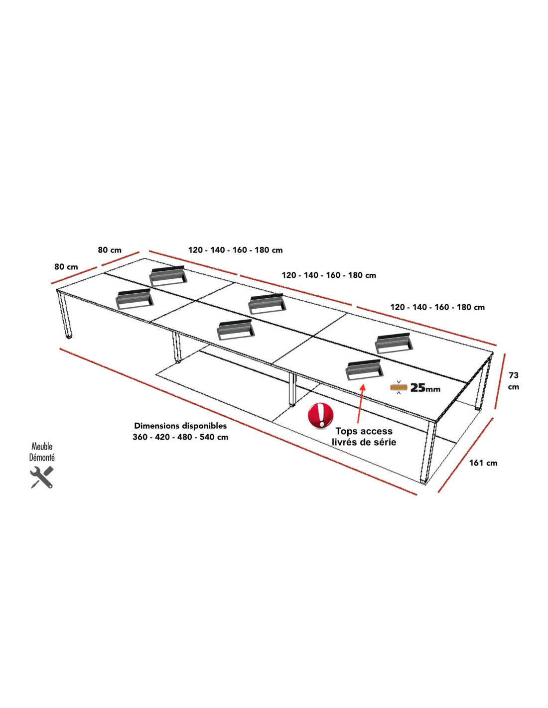 - Capacité et Configuration : Ce bureau est conçu pour accueillir 6 collaborateurs avec ses 6 plans de travail individuels. Sa configuration bench permet d'optimiser l'espace tout en gardant une cohésion d'équipe.
