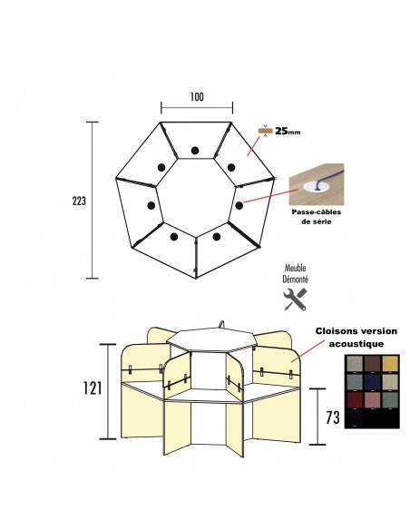 Le bureau de Call center version 7 places est réalisé en bois mélaminé disponible dans 12 teintes et dispose pour cette version de cloisonnettes en tissu ainsi qu’une mousse acoustique permettant de réduire les bruits environnants et améliorant ainsi le confort au travail.