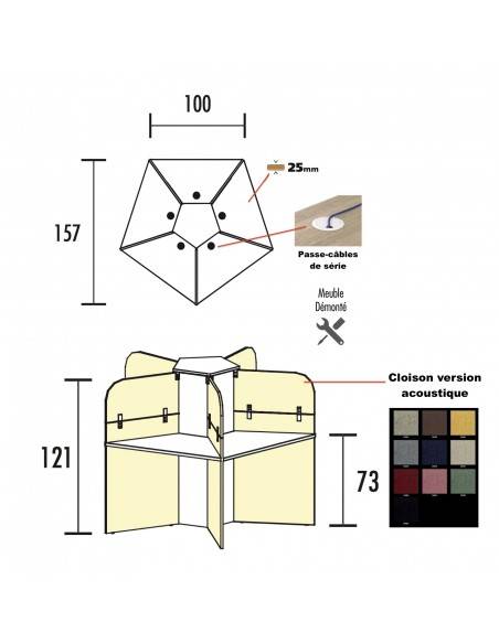 Le bureau de Call center version 5 places est réalisé en bois mélaminé disponible dans 12 teintes et dispose pour cette version de cloisonnettes en tissu ainsi qu’une mousse acoustique permettant de réduire les bruits environnants et améliorant ainsi le confort au travail.