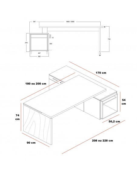 Le plan de travail spacieux, proposé en dimensions généreuses de 180 ou 200 cm, repose sur un meuble bas ingénieusement conçu pour optimiser l'espace et la productivité.