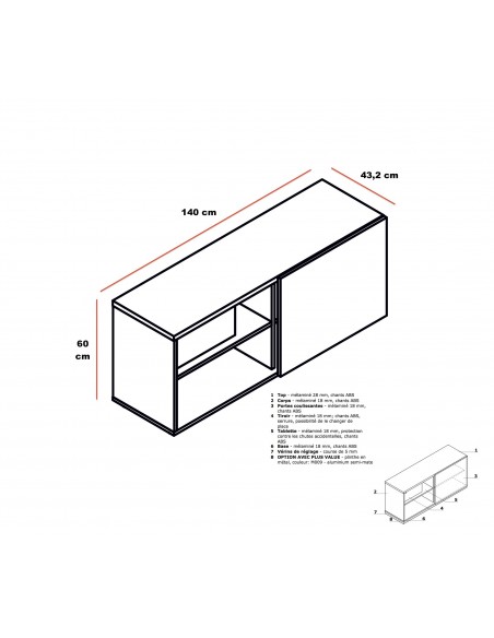 - Dimensions du meuble de rangement : Largeur : 140 cm, Prof. 43 cm, Haut. 60 cm