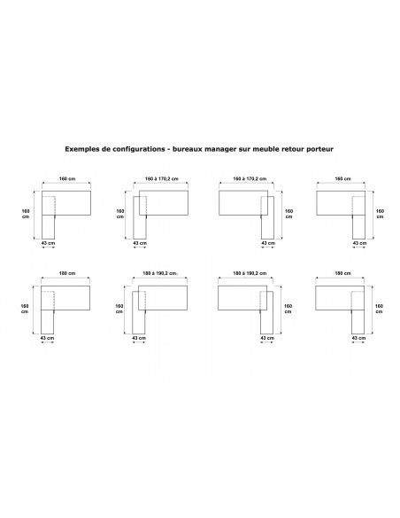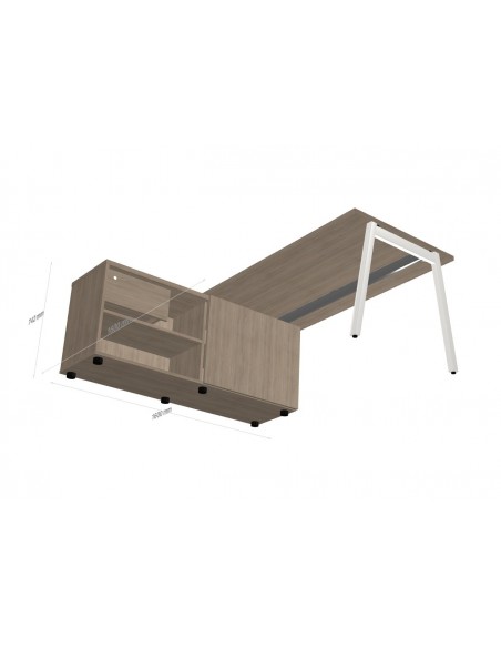 Le retour est représenté par une crédence basse avec porte coulissante et tiroir classique, permettant ainsi de bénéficier d’une solution de rangement de proximité très pratique pour les dossiers en cours.