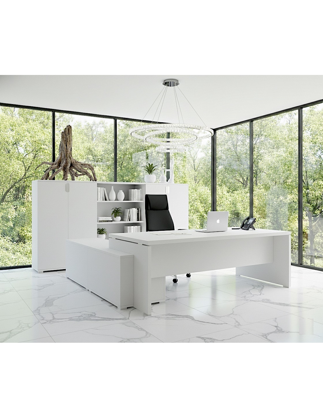 Pensé pour s'adapter à tous les espaces de travail, ce bureau droit est doté d'une crédence en retour, astucieusement conçue pour maximiser l'espace de classement à portée de main, cette version de meuble est proposée avec une porte coulissante mais en option, il est possible d'intégrer une seconde porte pour plus de confidentialité.