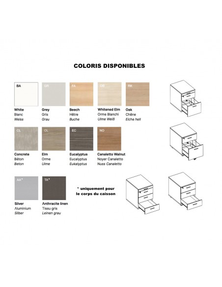 Les coloris des plateaux seront assortis à ce caisson créant ainsi un espace de travail harmonieux.