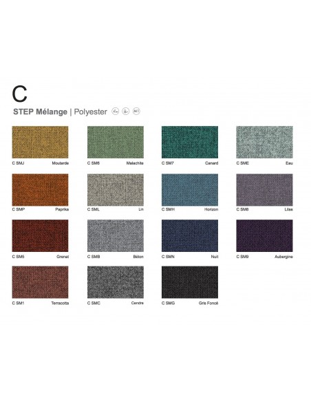 Présenté ici avec un revêtement bicolore de catégorie C Step 100% polyester, non feu M1 et mousse ignifugée.