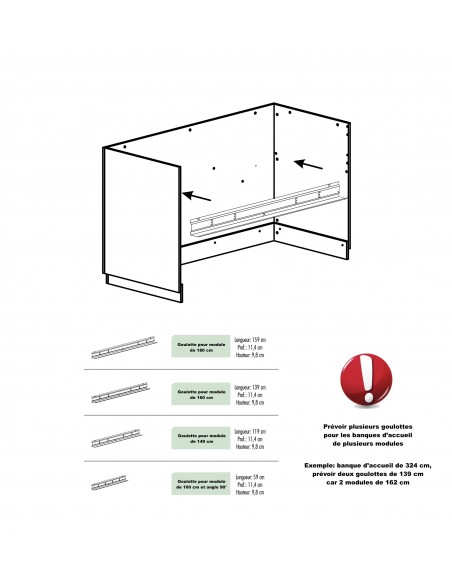 - banques d'accueil de largeurs: 284, 324 ou 364 cm, prévoir deux goulottes adaptées.