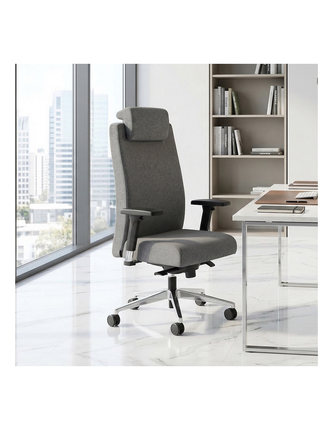 Le fauteuil de direction Bost est présenté ici en version tissu disponible en gris cendre ou bleu horizon chiné.