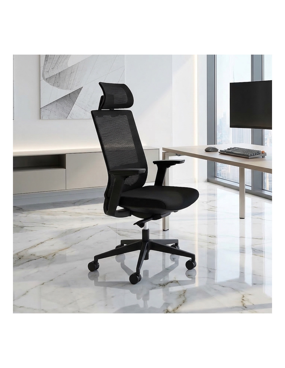 L'ensemble repose sur un piètement nylon noir 5 branches équipé de 5 roulettes grand format ( 60 mm ).