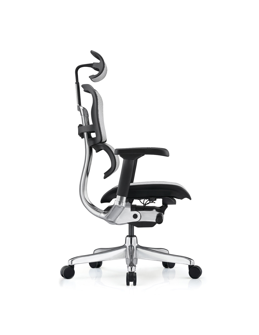 L'assise et le dossier sont habillés d'un tissu résille premium indéformable, disponible en noir ou gris. Ce matériau allie esthétique, respirabilité et grande résistance à l'usure. Pour une adaptation parfaite à chaque morphologie, l'assise est réglable en profondeur et le dossier en hauteur ("up & down"). La têtière, ajustable en hauteur et en inclinaison, complète ce système pour un soutien cervical optimal.